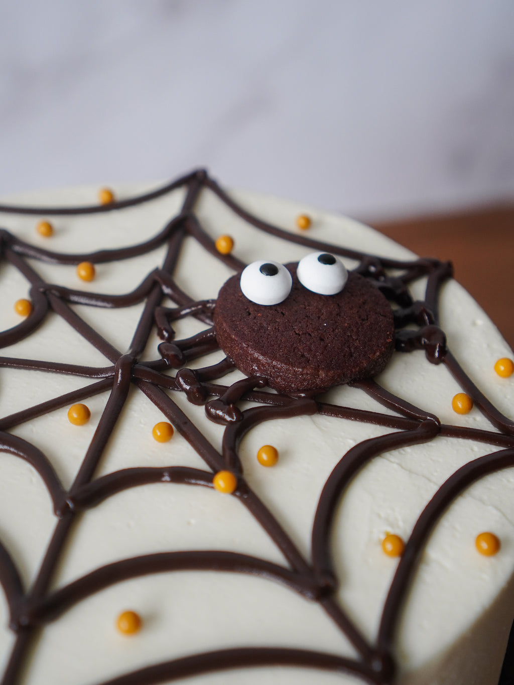 Butter cake layers brushed with lemon syrup filled with a blackcurrant compote, frosted with a white chocolate swiss meringue buttercream and finished with handpiped cobwebs and chocolate cookie spiders.