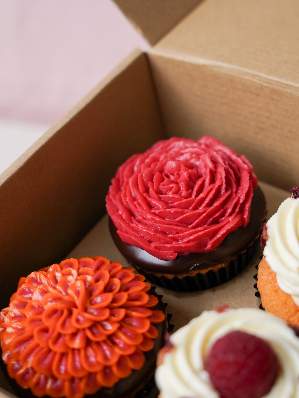 Send your love with this Box of 6 cupcakes featuring 2 Earl Grey Lavender and 2 Dark Chocolate Ganache cupcakes decorated with orange or dusty pink handpiped buttercream flowers with lavender frosting and 2 of our Monthly Special cupcake - Raspberry Rose.