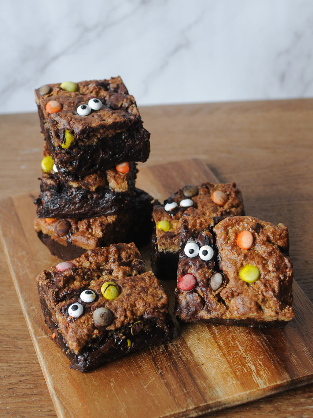 A set of 6 dark chocolate brownie-cookies decorated with chocolate chips, M&Ms and sugar candy eyes.