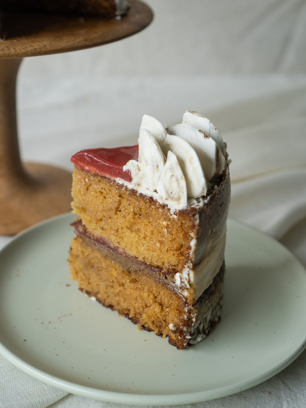 Olive oil thyme cake layers filled with housemade strawberry jam and an earl grey buttercream.